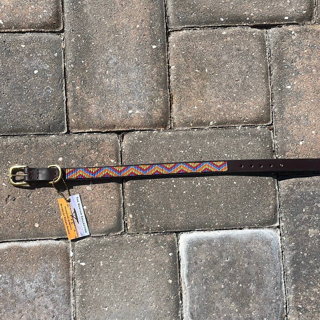 Every piece is individually handcrafted using high-quality and hard-wearing leather and hand-cast buckles & clasps. It takes on average a day for a mama to bead a dog collar and 2 days to bead a belt. The beads are hand sewn on the first layer of leather. Our workshop in Nairobi then adds the hardware and the second layer of leather, glued & sewn to the back for softness & durability.