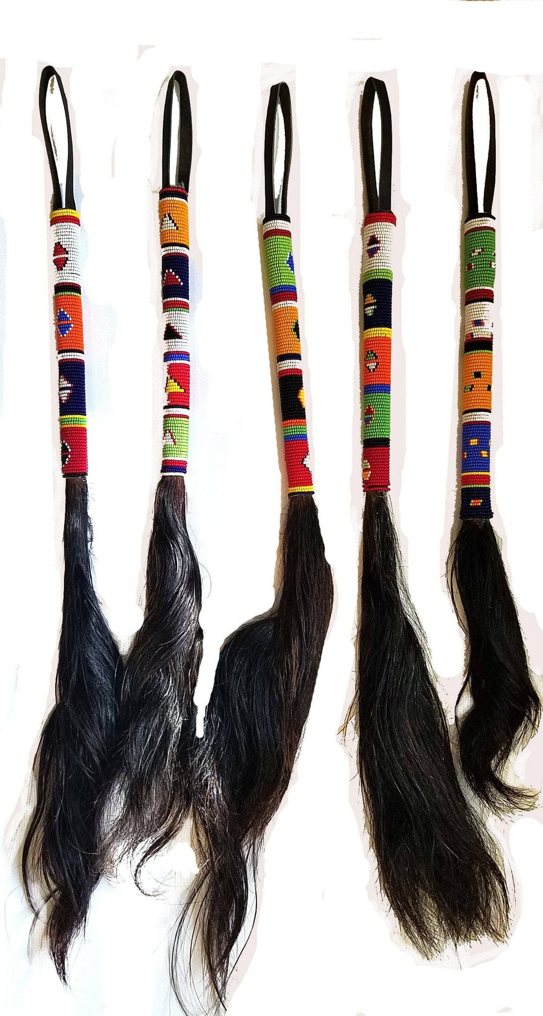 Traditionally carried by African nobility, including the Maasai, as a symbol of authority, this beaded fly whisk is not only a striking piece of art but also a practical tool. It effectively keeps flies at bay and creates a refreshing breeze on hot days. When not in use, it makes a captivating conversation piece when displayed on your wall.